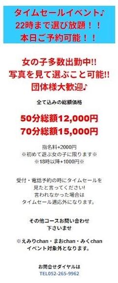 - 052-265-996210:00~24:0045分 15,000円~33%OFFぬきなびセール50分 総額12,000円